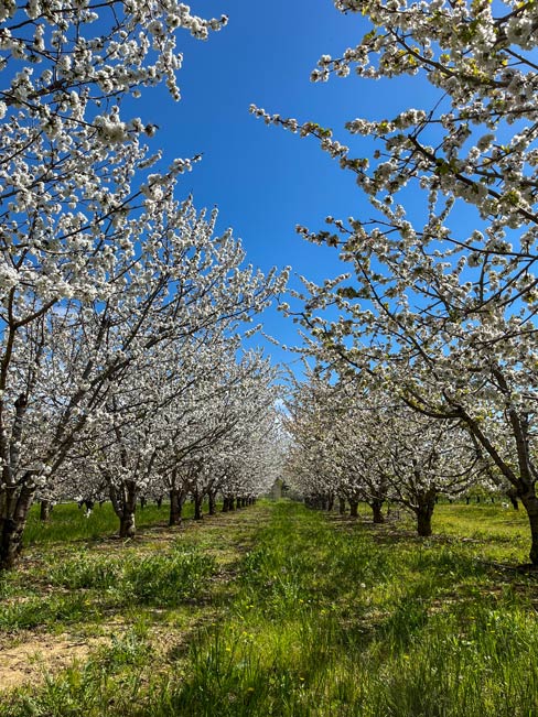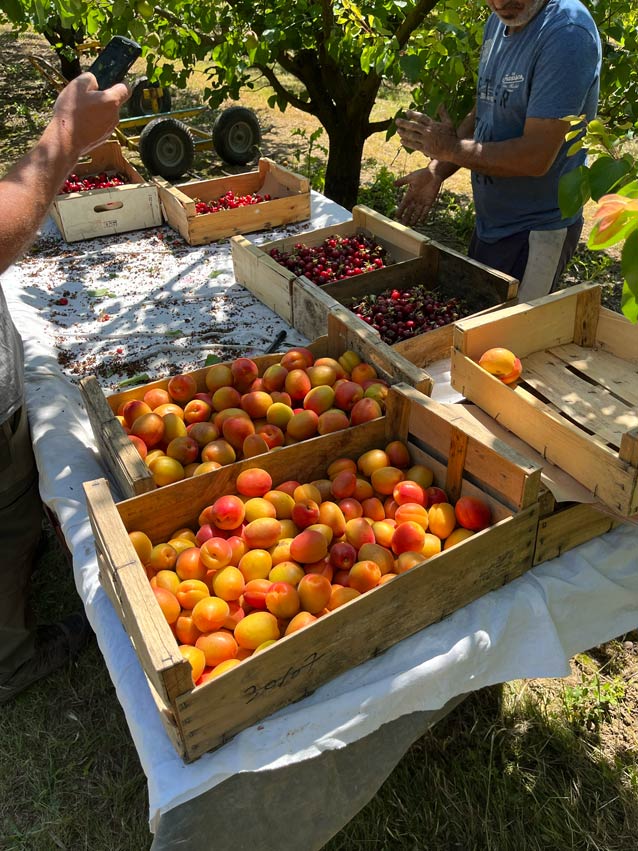 Aujourd’hui, en pleine saison, nous cultivons jusqu’à 60 hectares, répartis entre maraîchage et vergers. Une partie de notre travail repose sur des arbres fruitiers — cerisiers, abricotiers, pommiers, poiriers, cognassiers — qui demandent patience, rigueur et anticipation sur plusieurs années.